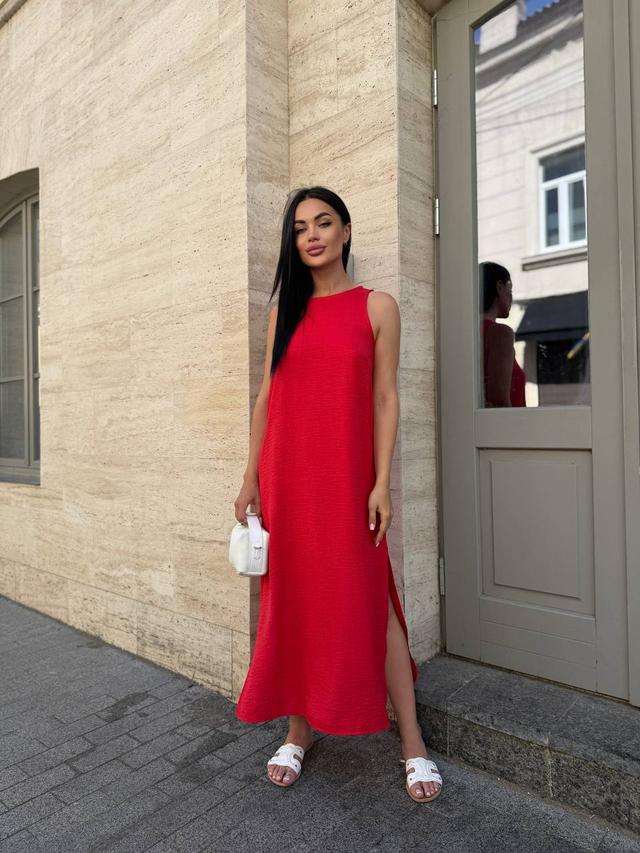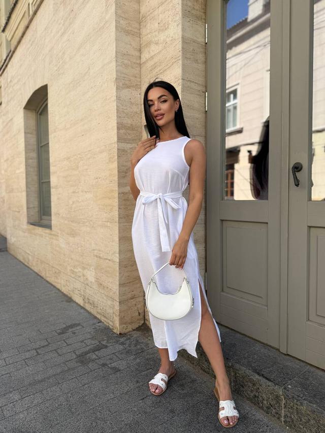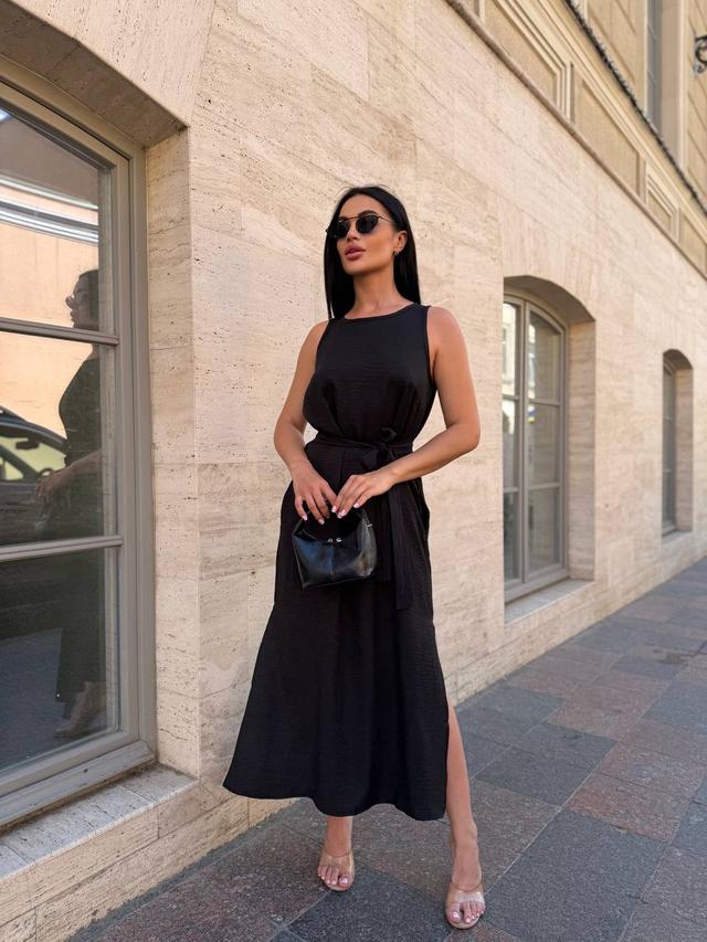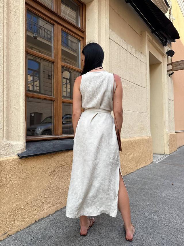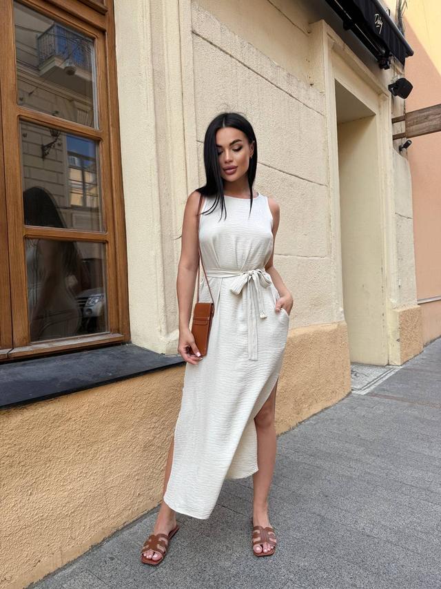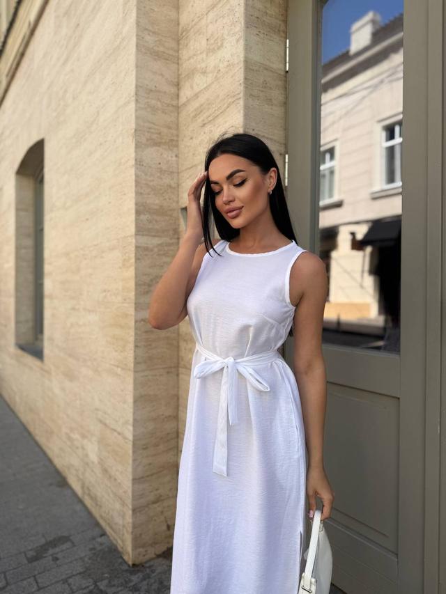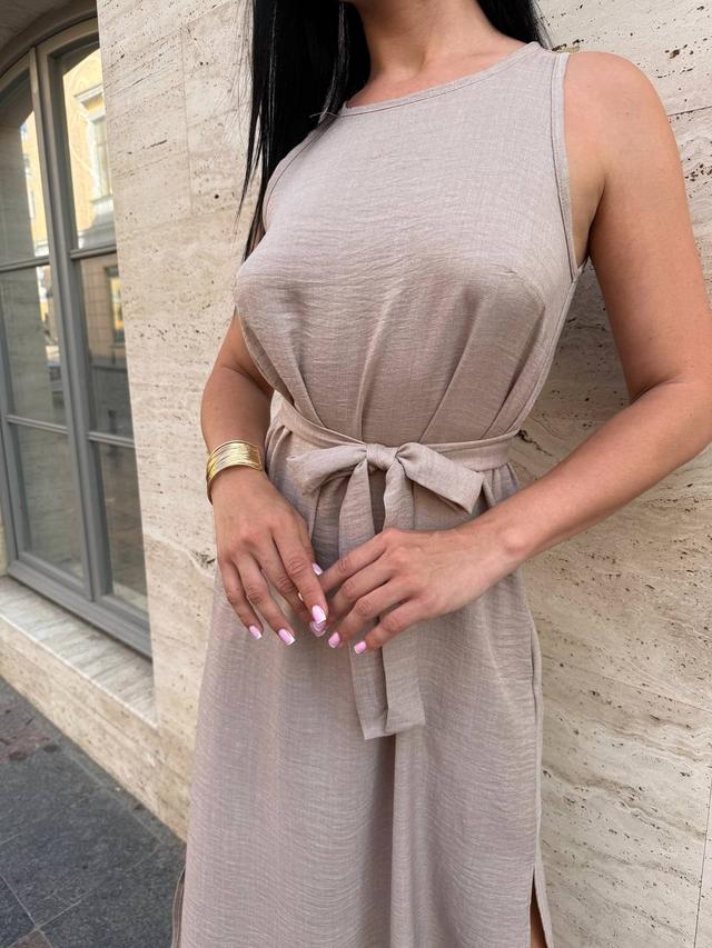👗 Подовжений фасон із вільною посадкою та поясом у тон дає змогу регулювати акцент на талії, створюючи вишуканий і водночас розслаблений образ. Плаття без рукавів відкриває плечі та додає легкості, а універсальний крій робить його чудовим варіантом для міста, курорту або офісу.