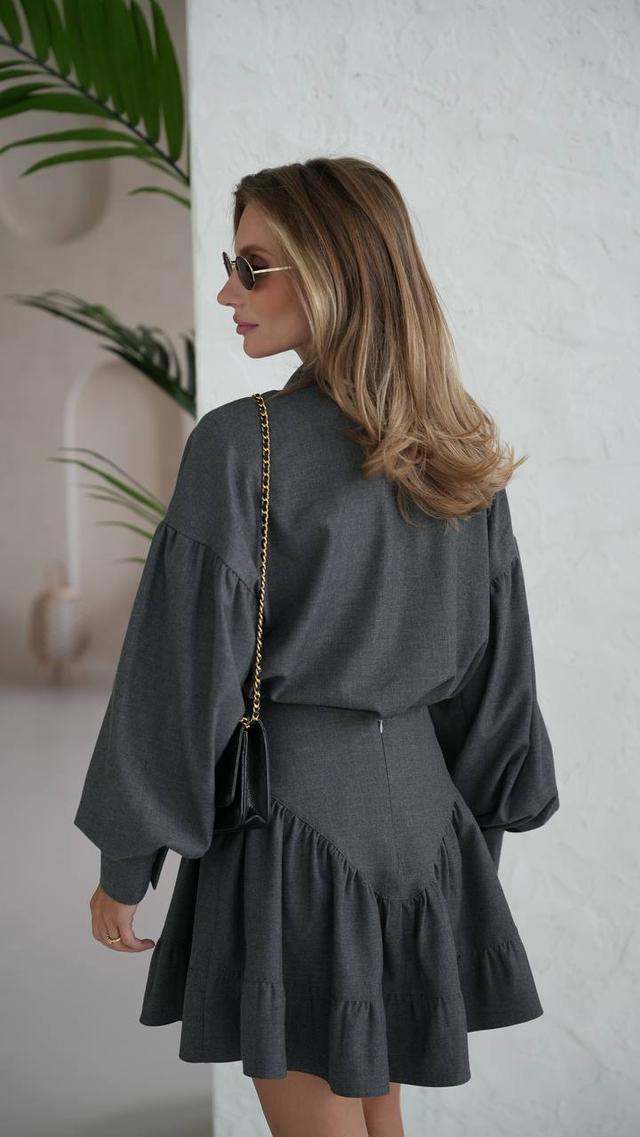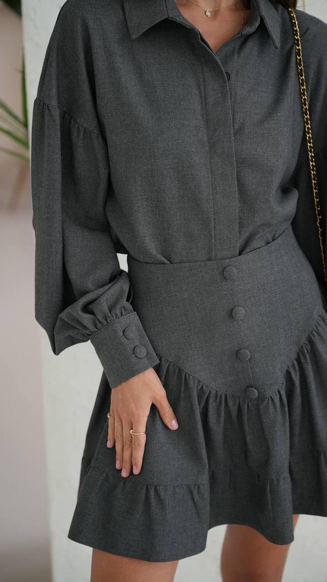 🔹 Спідниця з високою посадкою візуально формує тонку талію, створюючи жіночний силует. Декоративні ґудзики та м'які волани додають легкості та грайливості, а універсальні відтінки (бежевий, сірий, чорний, коричневий) дають змогу поєднувати комплект із базовим взуттям і аксесуарами.