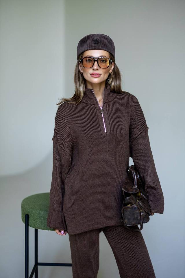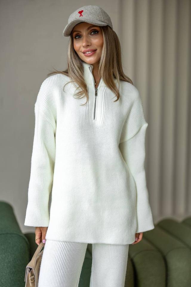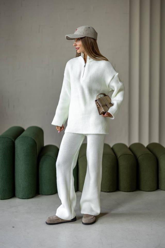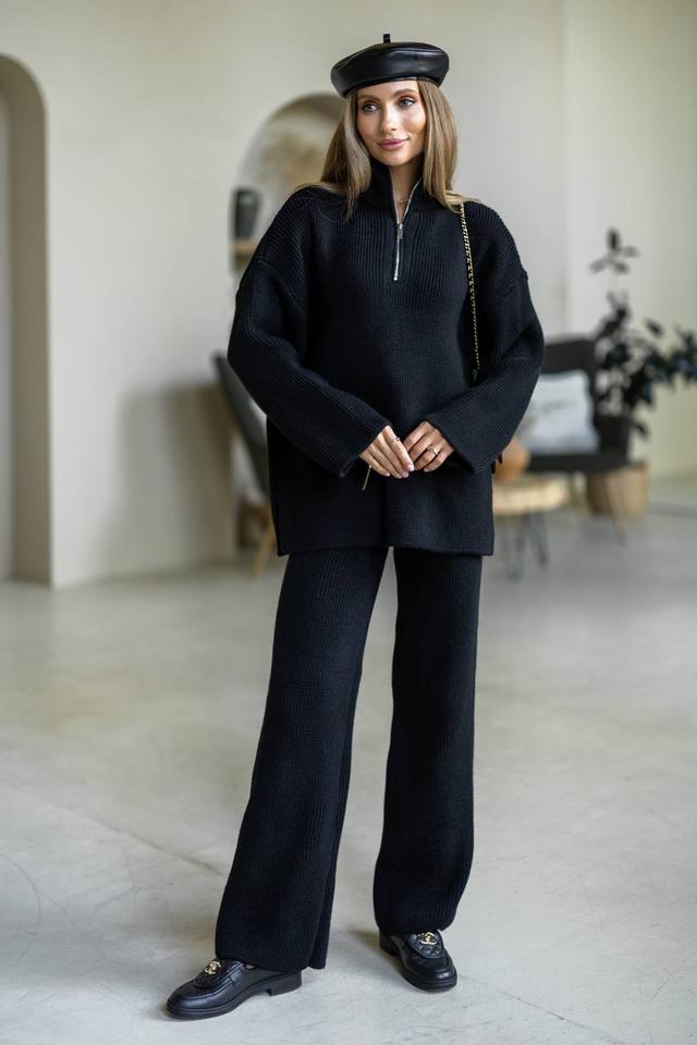 Вільний светр на блискавці та прямі штани на м’якій резинці створюють елегантний, розслаблений силует, який пасує кожній жінці, незалежно від типу фігури.